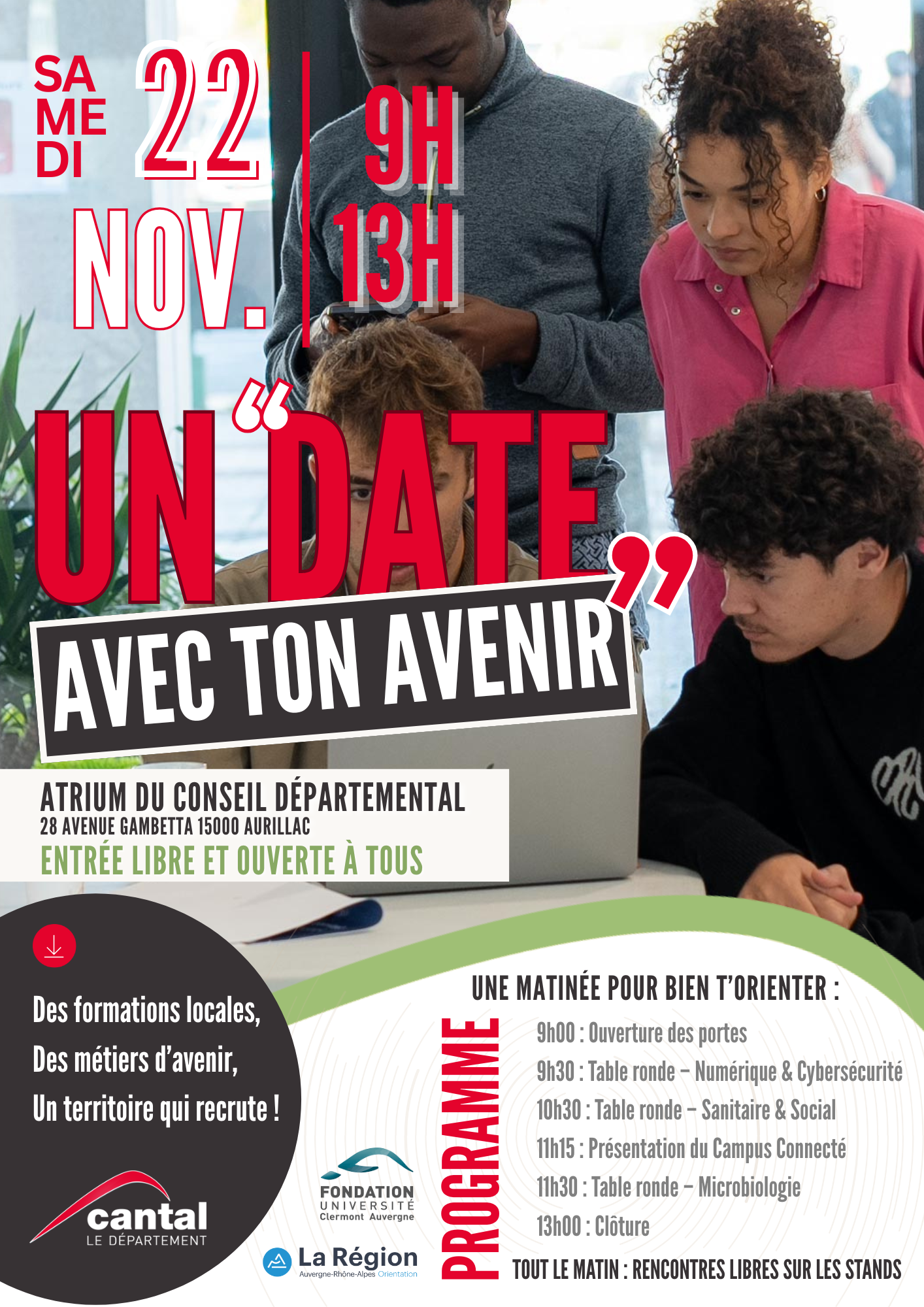Fort de ces savoir-faire, et afin de répondre aux enjeux de recrutement, cette matinée de l’orientation, à quelques jours de l’ouverture de la plateforme PARCOURSUP (17 décembre 2025), mettra en relation organismes de formation publics et privés, employeurs et futurs apprenants cantaliens dans un esprit de partage d’expérience et de convivialité, afin d’aider les participants à construire un projet d’avenir.